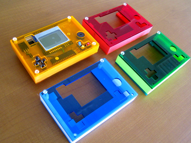 スマートシステム学科のオープンキャンパスは、模擬講義と体験学習のどちらかを選択する形式になっていますが、工作が好きな人やものづくりをしてみたい人は、是非こちらに挑戦してください!今回は、スマートデバイスとしてこのブログでも紹介された「GamePoy no!(ゲームっぽいの!)を作ってみようと準備を進めています。体験学習は短い時間ですが、スマートシステム学科で学ぶことのできる電気回路、プログラム、デジタルファブリケーションといったものをギュっとまとめて濃い内容、しかも面白い!ということを目指しました。前回、紹介したGamePoy no!(ゲームっぽいの!)は、基板がむき出しでいかにも試作品という感じでしたが、工学部に導入されているレーザー加工機や3Dプリンターを活用し、本当にゲーム機のようなスタイルにまとめてみました!