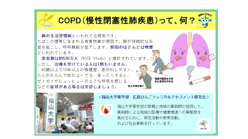 COPD って、皆様はお聞きになられたことがありますか?肺の生活習慣病と言われている病気です。             健康福山21フェスティバル2021への出展
