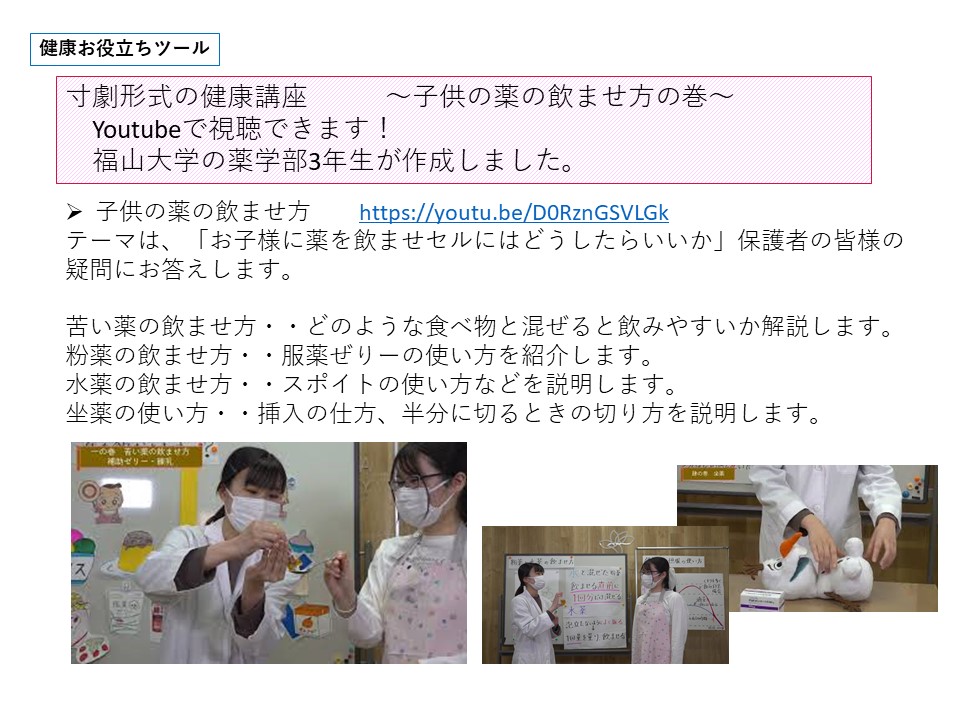 また、健康お役立ちツールもあります。こちらでは、学生が作成した寸劇形式の健康講座が見られます。是非ご覧になってみてください。また、来春にはさらに二つの寸劇をアップする予定です。楽しみにしてくださいね。