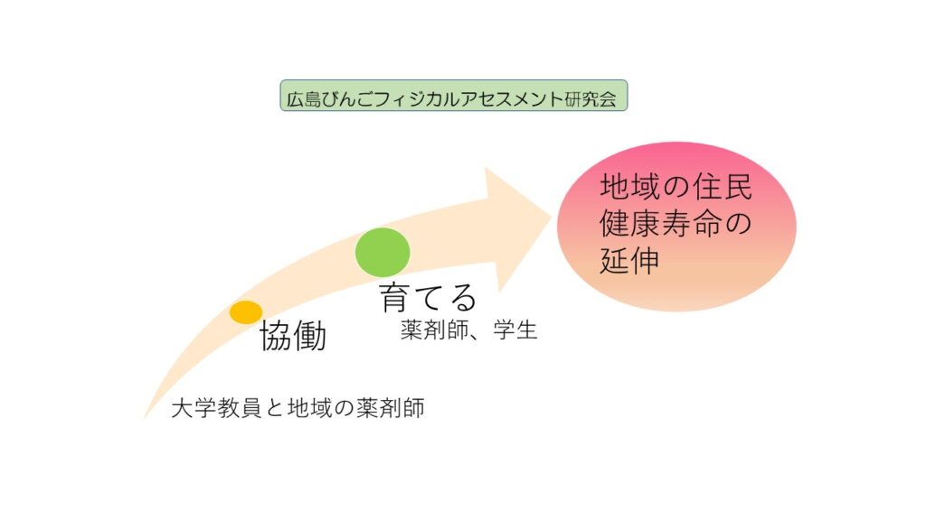 広島びんごフィジカルアセスメント研究会は、薬剤師が地域住民のセルフメディケーション、在宅医療、薬物療法に携わる上で有効な情報収集の手段となるアセスメント技能の修得や得られたデータを有効活用する手法を確立し、薬剤師の資質向上と薬剤師による医療や地域への貢献度を高めるための研究・教育活動を行うことを目的とした研究会です。