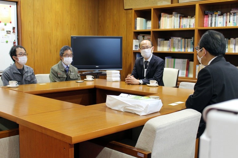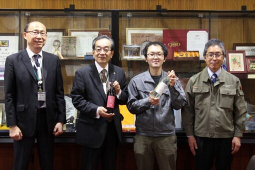 2019年に生命工学部生物工学科を卒業し、今年の7月に弱冠25歳でせらワイナリーの醸造責任者に就任した橋本悠汰醸造責任者(広島県立福山明王台高等学校卒業)が、(株)セラアグリパークの宮本幸三常務とともに学長室を訪問し、醸造責任者として初めて醸したワインを大塚学長に持参されました。橋本氏は、中四国ワイナリー協会に加盟する23のワイナリーの中でもとびきり若い最年少の醸造責任者だそうです。