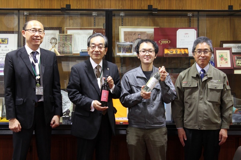 学長から一言:生物工学科卒業から3年目にして早くも「せらワイナリー」の醸造責任者として活躍している橋本悠汰さんが、上司である株式会社セラアグリパーク常務の宮本幸三様と一緒に、自らの初作品であるワインを携えて学長室を訪ねて下さいました。60トンものブドウの仕込みの全責任を任されたのです。抜擢して下さった会社に心から感謝ですが、橋本さんにしてみれば、たいへんな重圧だったことでしょう。それでも同学科4年生の後輩で、助っ人を買って出た深光純弥さんの協力もあって、見事に責任を果たしたという苦労話は感動もの。しかも、岩本教授など学科の教員は学生が卒業した後も何くれとなく気にかけて、世羅まで足を運んだり、相談に乗ったりしているとのこと。本学は「面倒見の良い教育」を誇りにしていますが、これほどの手厚さは他所ではなかなか見られないでしょう。