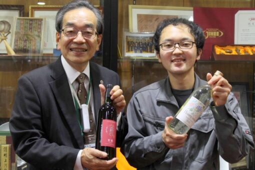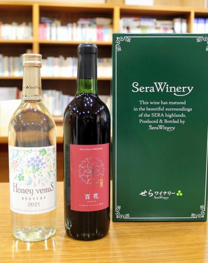 今回、大学に持参されたのは、上の仕込み風景動画にあるハニー・ビーナスのヌーヴォー(その年に収穫したぶどうを醸造した新酒ワイン、ボジョレ・ヌーヴォーが有名)と橋本くんが3年前せらワイナリーに入社した年に初めて仕込み、樽で熟成させていた “百花 マスカット・ベーリーA”の2本です。“ハニー・ビーナス ヌーヴォー”は、まるでぶどうジュースを飲んでいるようなさっぱりとした口当たりの甘口ワインで、ワインが苦手な方でも美味しくいただけます。“百花 マスカット・べーリーA”の方はまだ飲んでいないので、どんなワインか楽しみです。