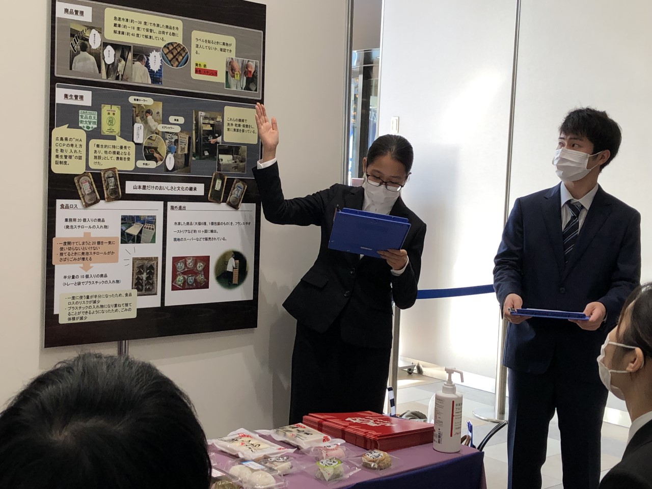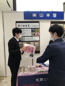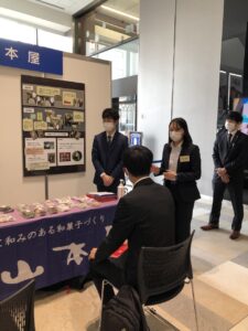 和菓子製造の企業の発表は、心理学科の平ゼミのチームです。企業理念にスポットを当てて、社員の日頃の姿勢や働き方を説明しました。また、安全で安心な商品づくりを目指すための様々な取り組みや、さらには海外にも和菓子を輸出していることなどをフリップや現物の商品を見せながら説明しました。説明終了後は、卓上に陳列した桜餅をはじめとする全ての商品を紹介して、多くの来場者の人気を博していました。