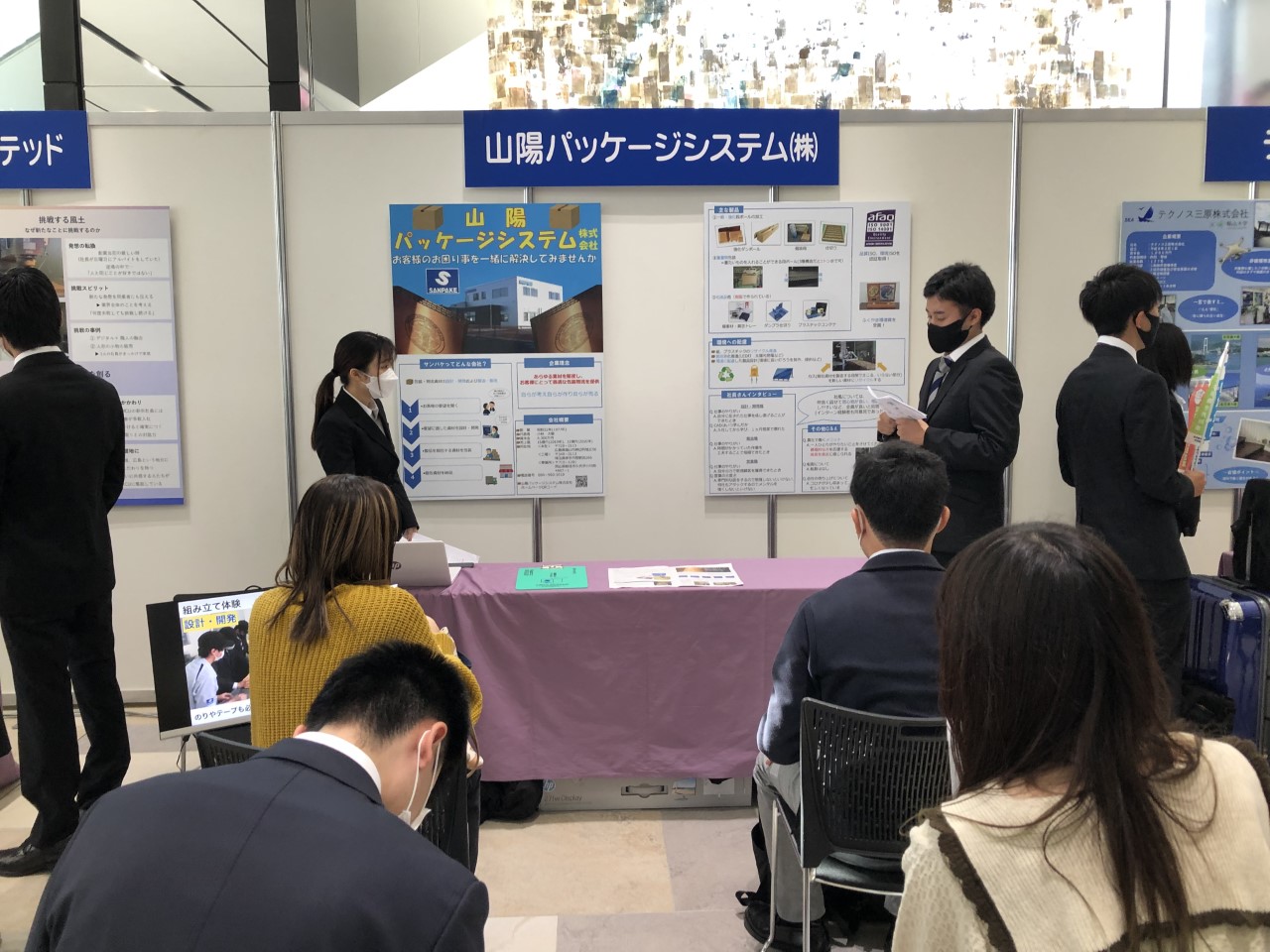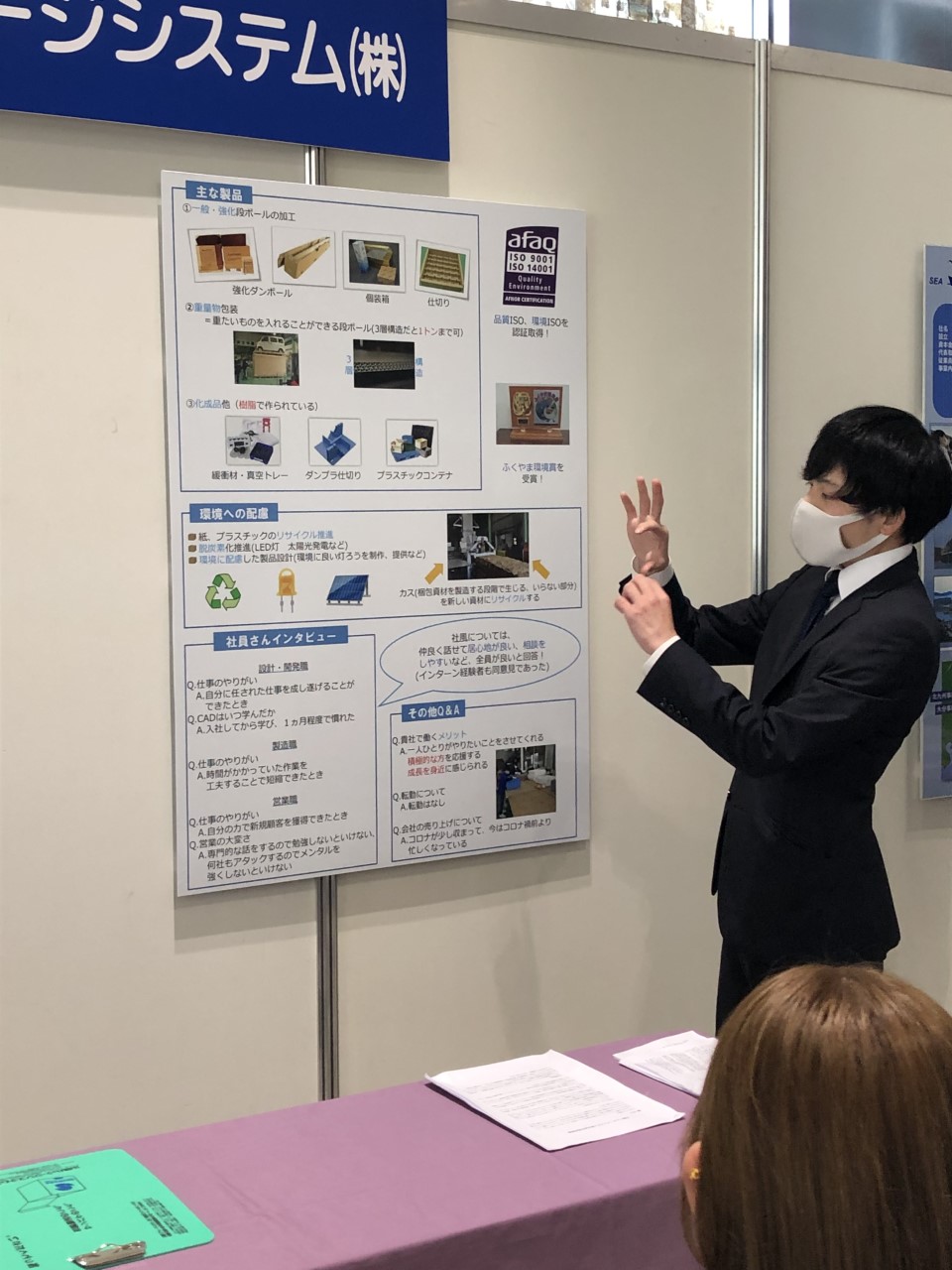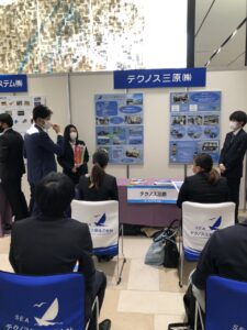 来場した学生たちが「知らない会社だけど聞いてみようかな」と思えるようなインパクトのあるポスターが並び、隣から隣へと移動しながら聞いていました。また、企業ブースへの来訪者が1人でもいれば説明を開始するため、11時から15時までの約4時間、繰り返し発表を行っていました。そのため、最初はぎこちなかった説明も最後にはアドリブで来場者の興味を惹きつけられるようになった学生もいました。
