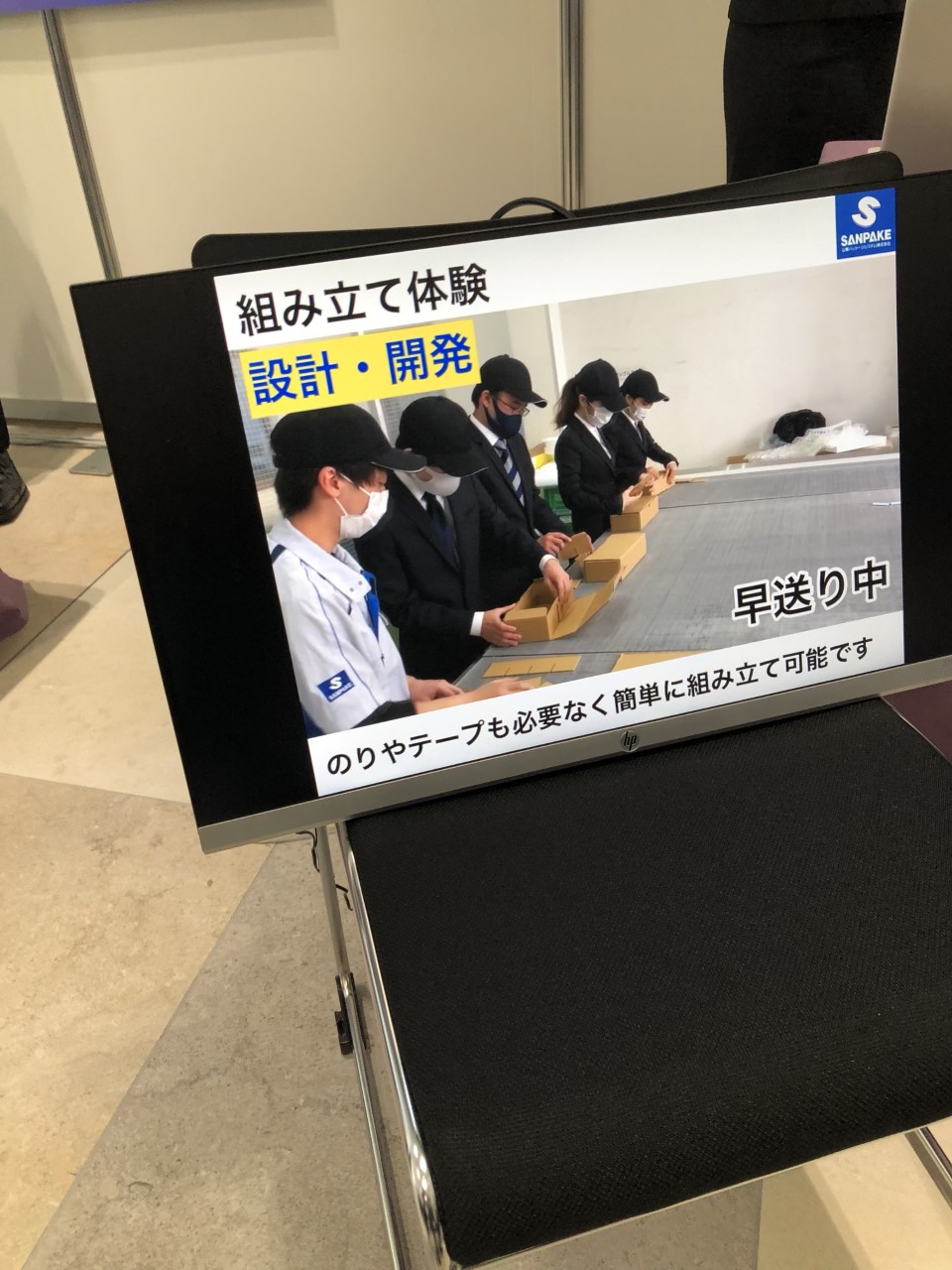 梱包資材の製造メーカーを発表したのは、経済学科の佐藤ゼミと田中ゼミのチームです。自分たちが、見学時に段ボール箱の組み立てを実際に体験した映像や製造工程の動画を流しながら普段は目にしない製造工程をイメージしやすいように工夫していました。また、SDGsに向けた実践がなされていることやリサイクルで環境にやさしい企業を目指していることなどを説明しました。
