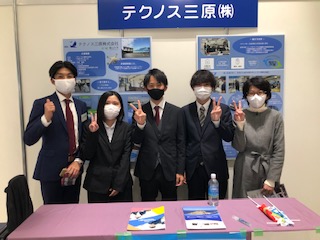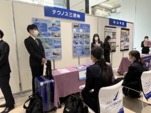 船舶や橋・建物の大型建造物の非破壊検査の企業を紹介したのは、経済学科の高羅ゼミのチームです。聞きなれない非破壊検査とはどんなことをするのか、実際の現場の写真を提示しながら来場者にそのスケールの大きさを説明しました。また、フィリピンへの6ヶ月派遣を通して語学を学べること、働き方改革に力を入れられていること、奨学金返済の支援があることなど福利厚生もしっかり説明し、来場者からも質問が飛び交いました。