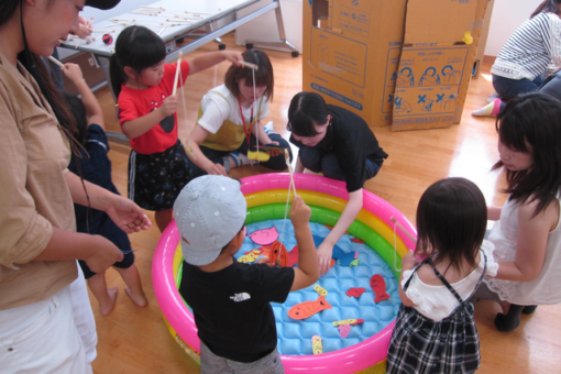 7月28日には「夏祭り」のイベントを実施し、学生達は魚釣りゲームと綿菓子作りを企画・実施しました。事前に、子ども達が釣るための魚を70匹も作成しました。そのかいあって、当日は、乳児から小学生までがイベントに参加してくれ、親も含めると45名の参加者があり大盛況でした。
