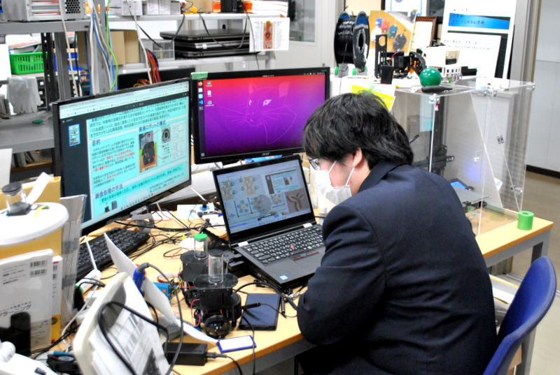 ゼミ室からオンラインでポスター発表の質疑応答をする村上君