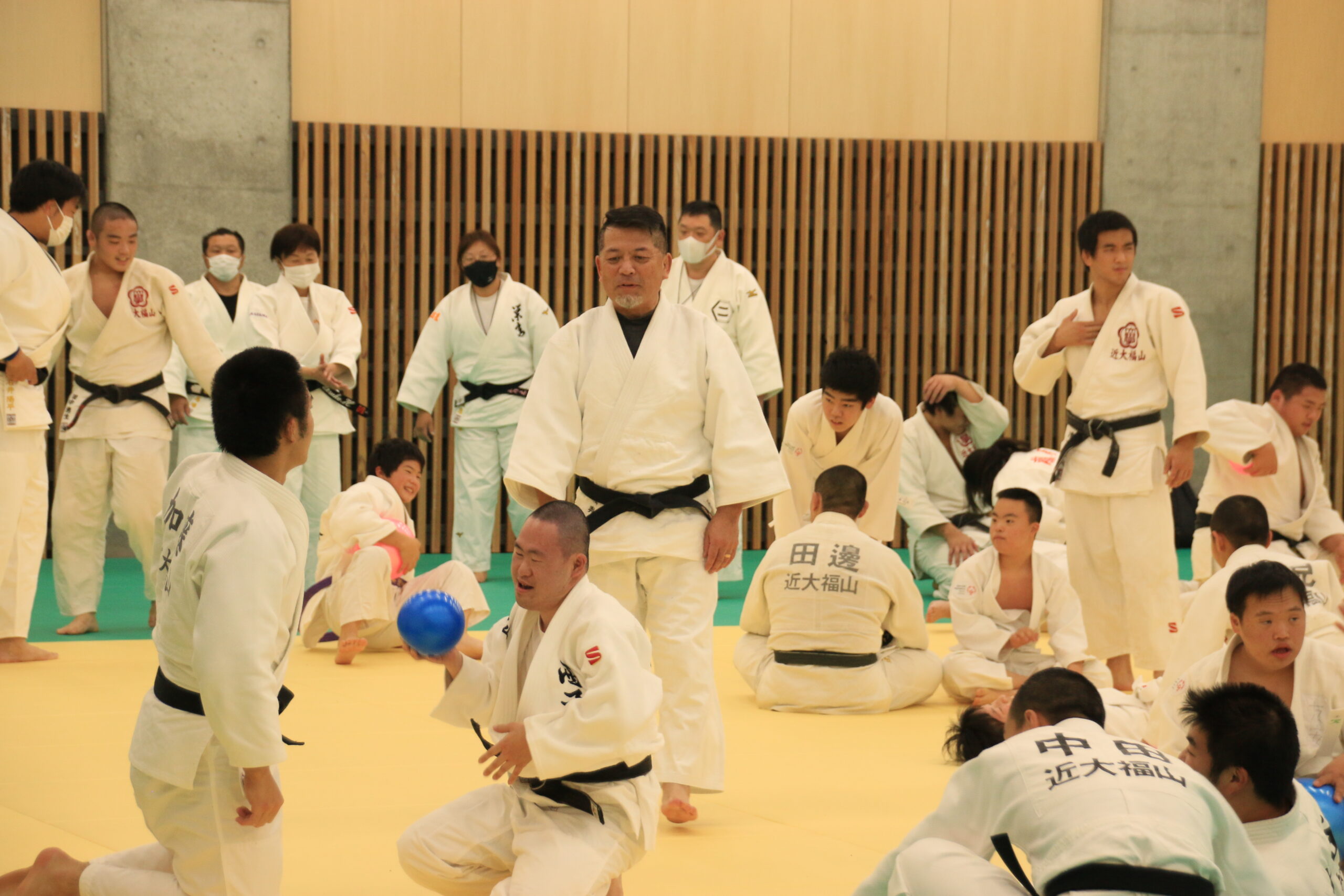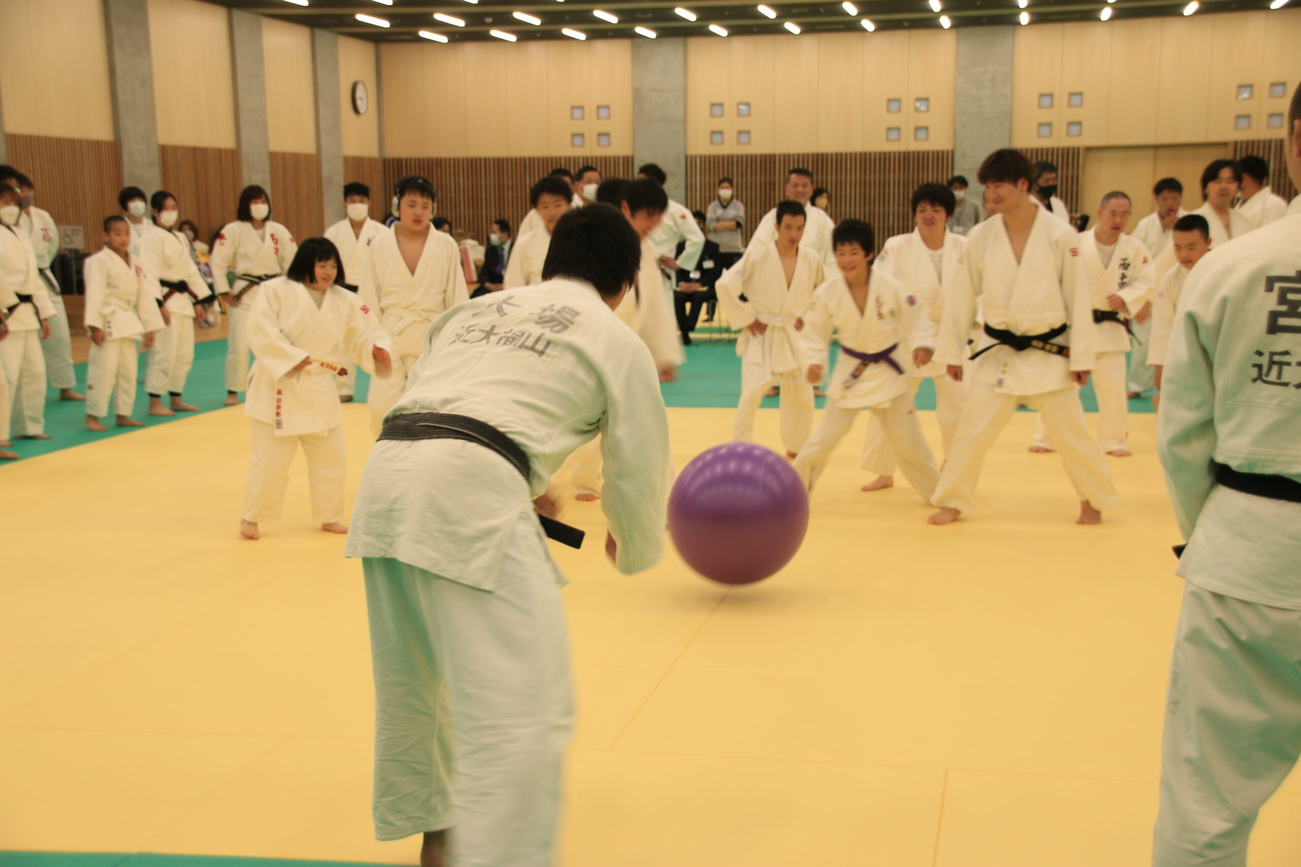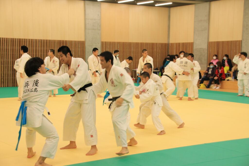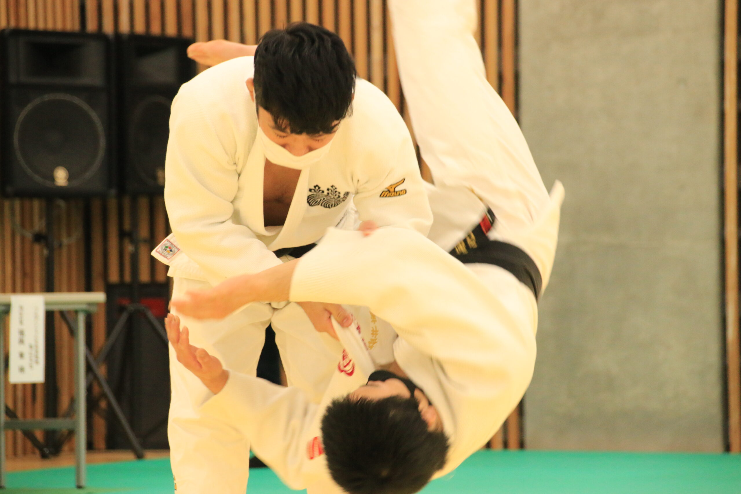 また、開会式が終わり予選が始まる前に、平岡氏による模範演技の披露が行われました。背負い投げなどの技を披露していただき、また自身が相手のどの辺を掴み、どのように技をかけているかを解説してくださいました。目の前で行われるプロの柔道家の技は、とても迫力がありました。