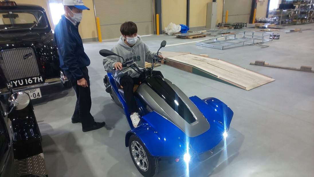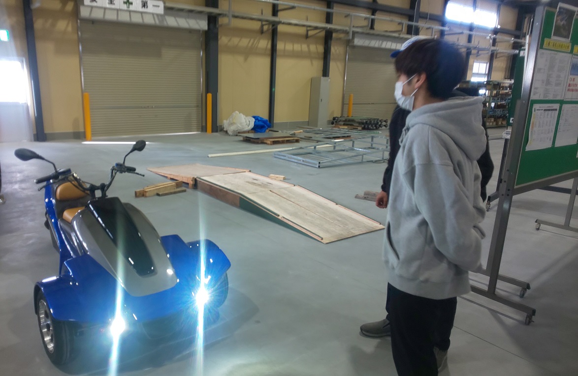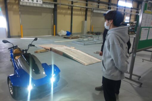 完成した車両は、両備テクノモビリティカンパニー吉備工場(岡山県吉備高原都市)で動作実験を行っています。開発に関わった2年生の船木君と吉備工場を訪問しました。
