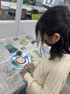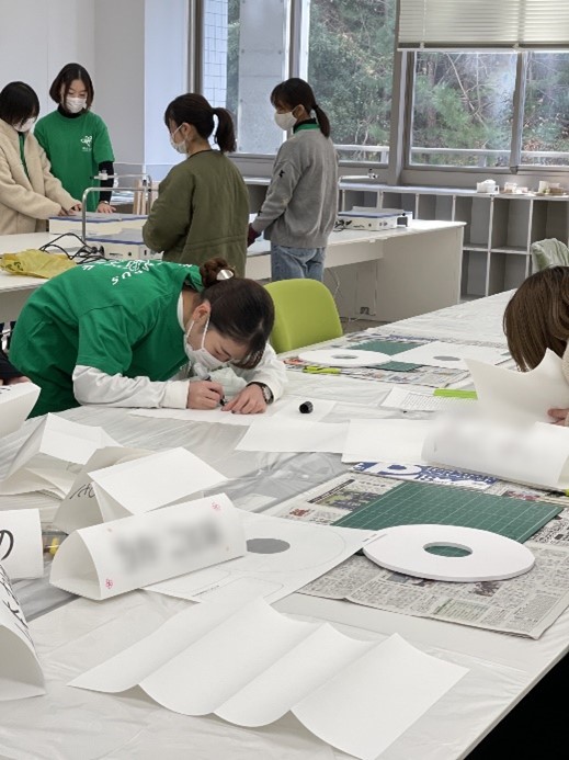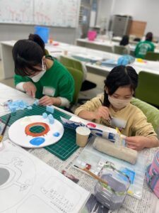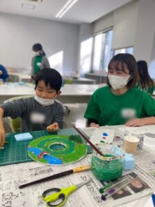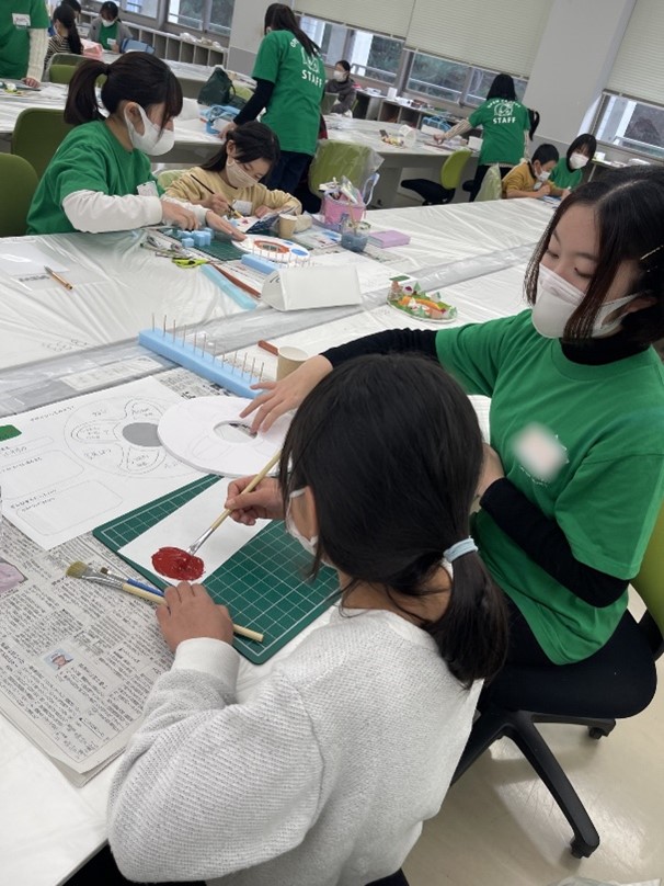 私たち学生と一緒に作業をします!カッターを使った難しい作業は私たちが手伝います。色塗りも小学生と一緒にして、手が大変なことに!もちろん、小学生たちは楽しそうに作業していましたが、私たちも一緒に作業できるという事が同じくらいとても楽しかったです。