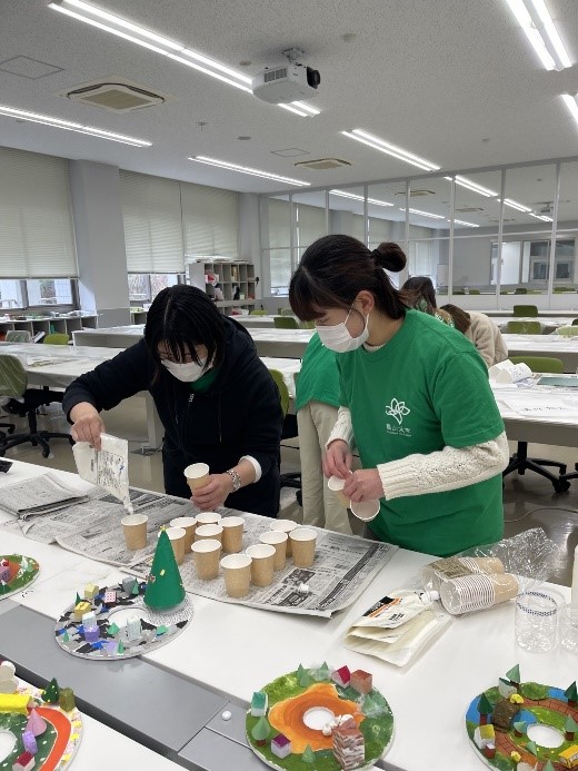 学長から一言:びんご建築女子が小学生のために「模型教室」を開き、今年は『クリスマスリースで自分のまちをつくろう!』と頑張っていることは、以前のブログでも伝えてありました。それが実現しましたね。大いに盛り上がったようで、頑張った甲斐がありました。建築学科にふさわしく、「街作り」の夢を込めたステキなリースがたくさん出来上がったことでしょう。クリスマスにも間に合って、参加した子ども達は今年はきっとひと味ちがった聖夜を迎えますよ。
