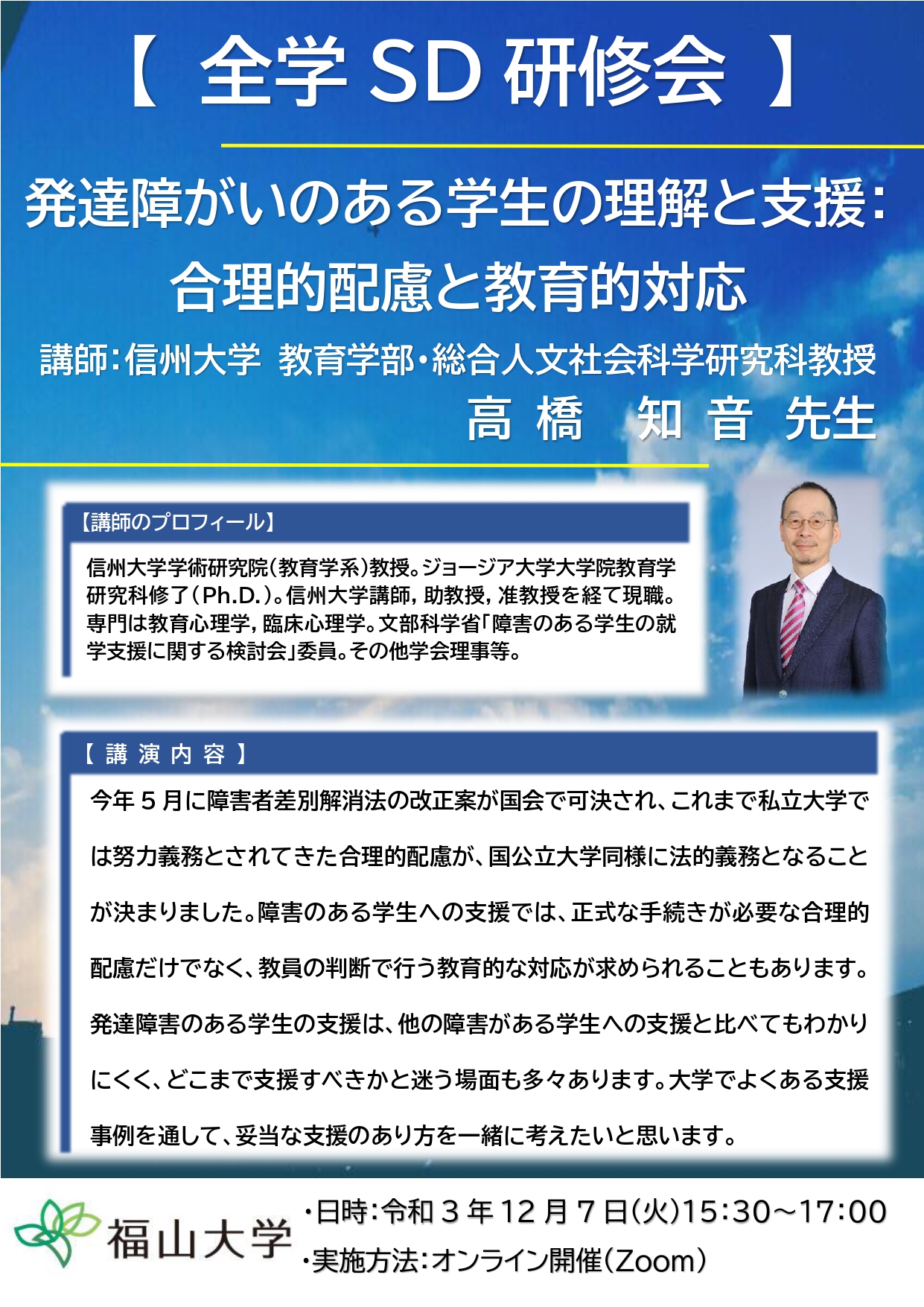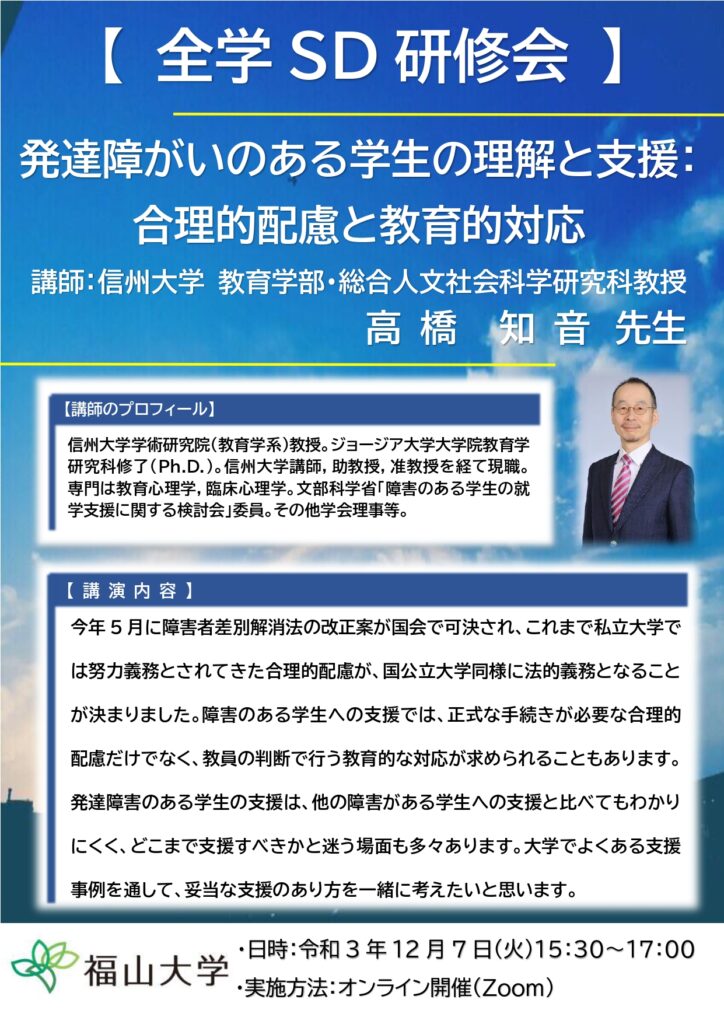 【全学SD研修会】「発達障がいのある学生の理解と支援-合理的配慮と教育的対応-」をオンラインで開催!