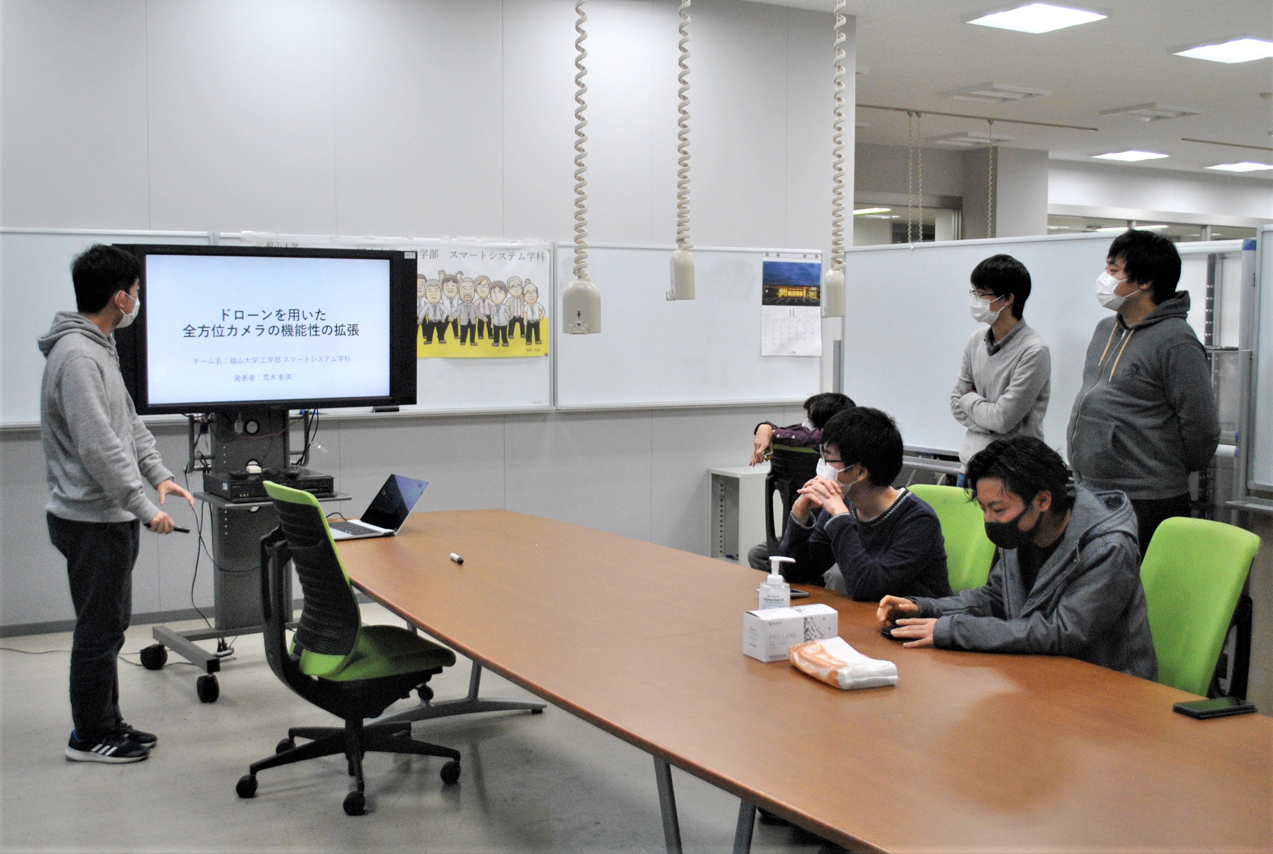 今年度の2年生のドローンプロジェクトチームは、「ドローンを用いた全方位カメラの機能性の拡張」というテーマで、ひろしまヤングベンチャー賞科学・技術分野での金賞受賞を達成しました。これは、昨年度のチームが銀賞を受賞した研究を発展させたものであり、本学卒業生から昨年寄贈された多数のドローンを活用した成果です。また、彼らが1年次から取り組んでいるレスキューロボコンを応用し、災害発生時の情報収集のためにドローンの活用を提案するものです。
