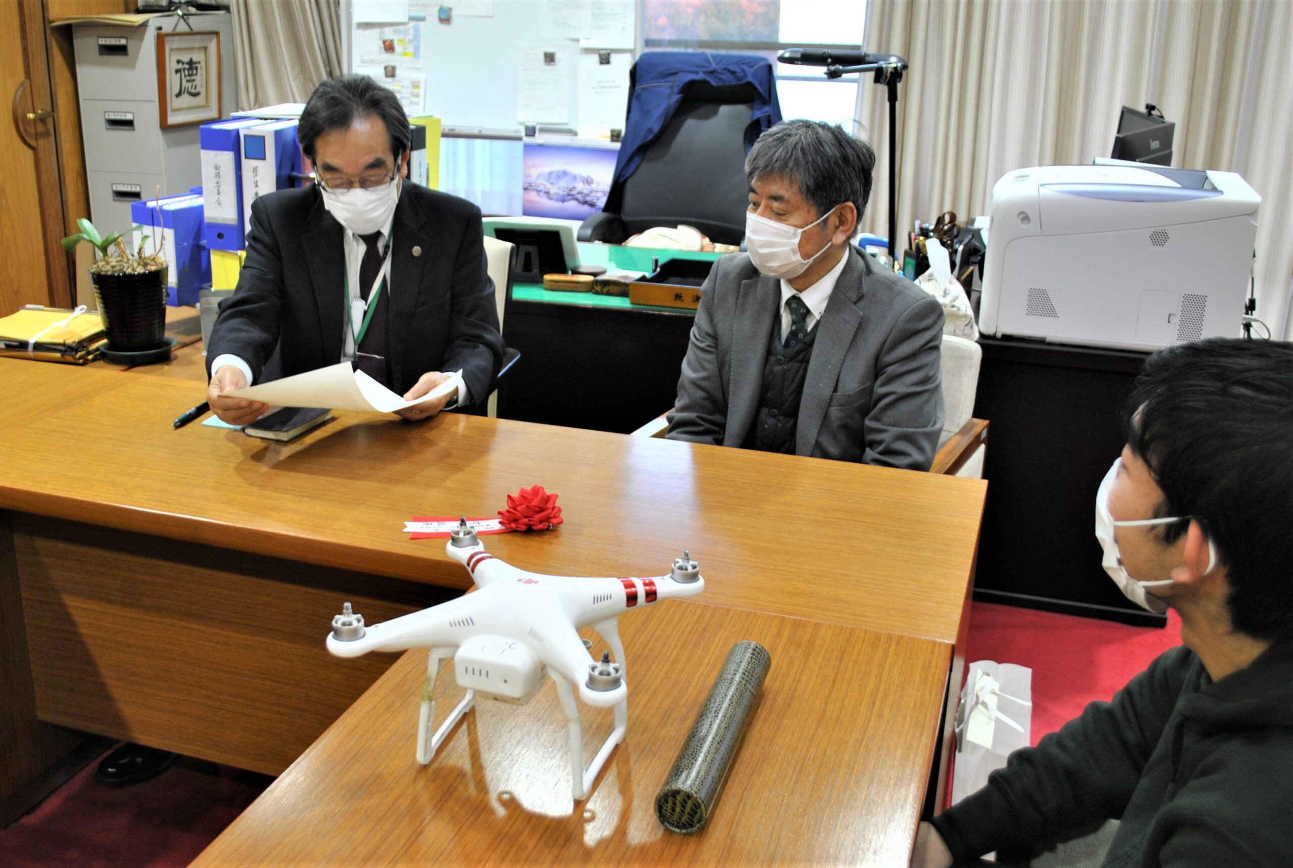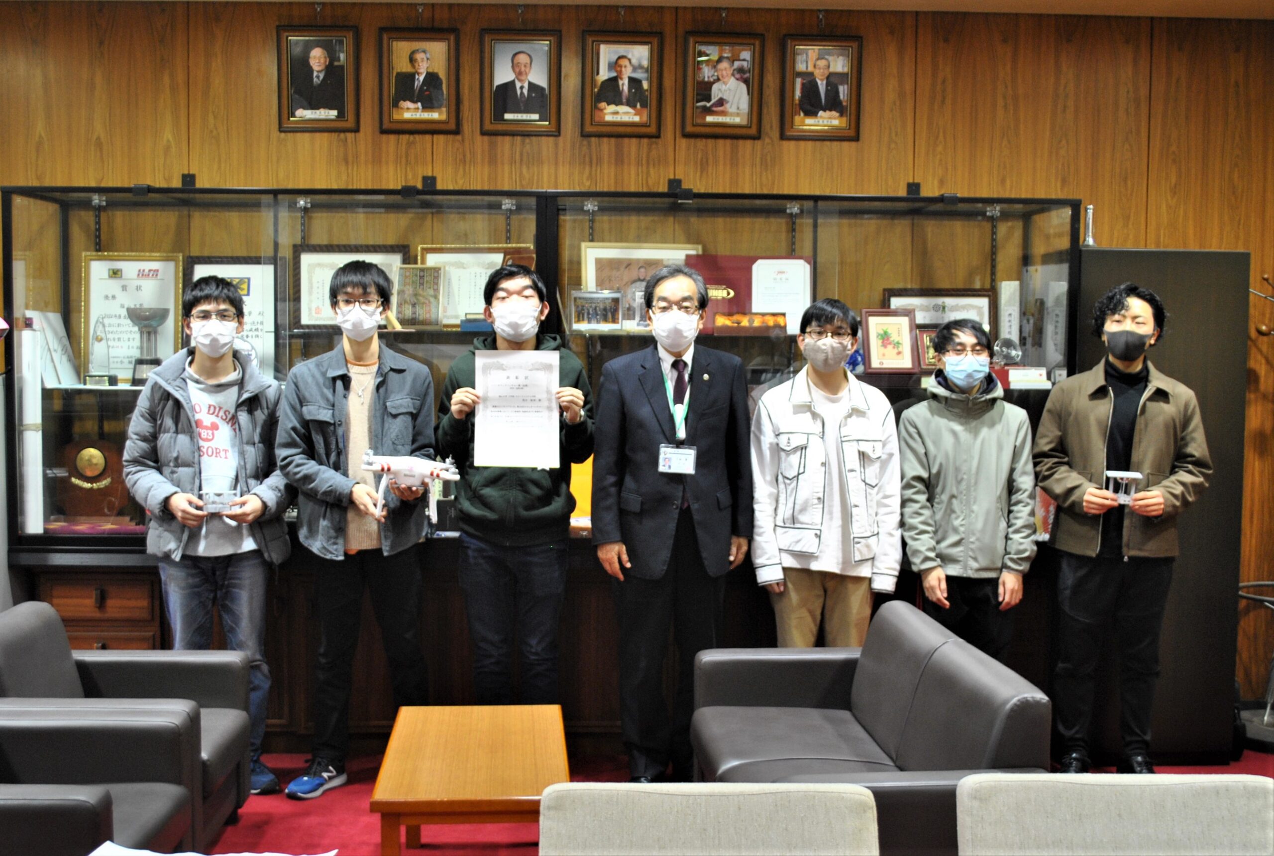 学長から一言:スマートシステム学科のドローンプロジェクトチームの皆さん、ベンチャー育成のコンテストでの栄えある金賞受賞、本当におめでとう! 日頃の研究や努力の様子を直接に聞く機会も持つことができて、皆さんの頑張りの様子がよく分かりました。私が知らなかっただけでしょうが、ドローン技術はあれよあれよという間に世の中に拡がり、撮影や運搬手段、さらに軍事技術にも応用されたり、今や社会の中ですっかり地歩を固めてしまったようです。人を傷つけたり、マイナスの機能ではなく、世のため、人のためになる使い方をこれからも次々と考え出してください。