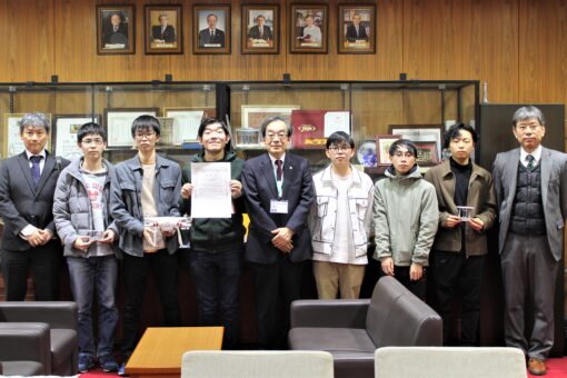 (左から)畑祐貴君、松本直樹君、荒木彰英君、大塚学長、市川智也君、陳巧羅君、山田幸輝君