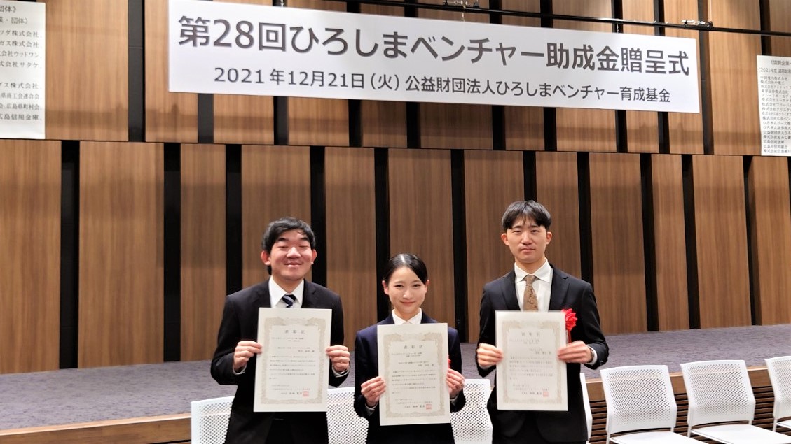 今回は、12月21日(火)に助成金贈呈式が広島市内で開催され、プロジェクトリーダーの荒木君が参加しました。昨年度の贈呈式にはコロナ禍への配慮から参加を見送りましたが、今回は参加することができ、これまた貴重な経験になりました。