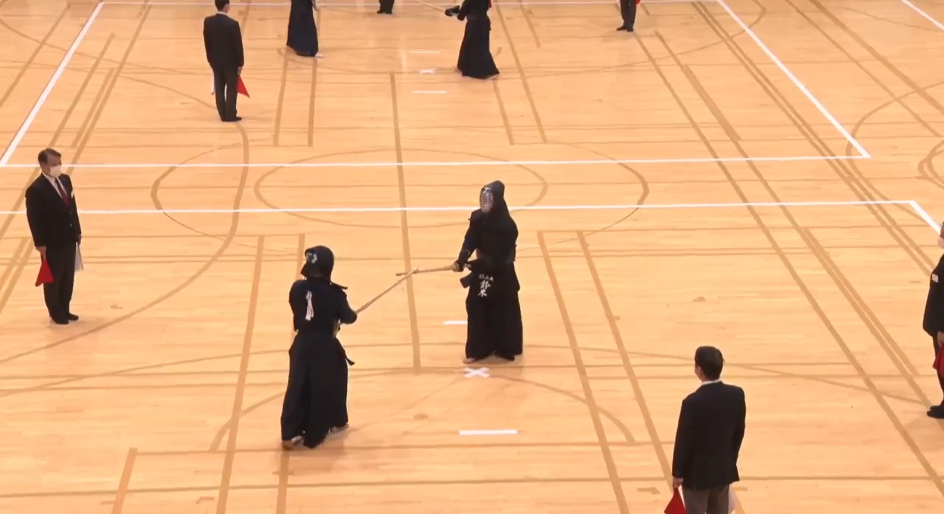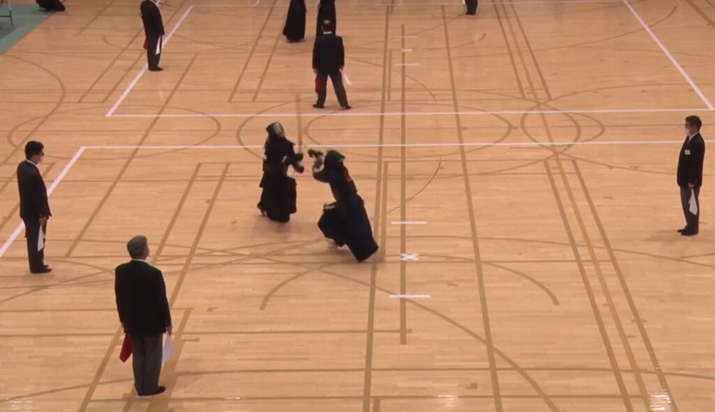 激しい間合いの攻防の中から一閃した佐野さん(後ろ姿)の会心の面。この時、竹刀は既に相手の面に届いていました。