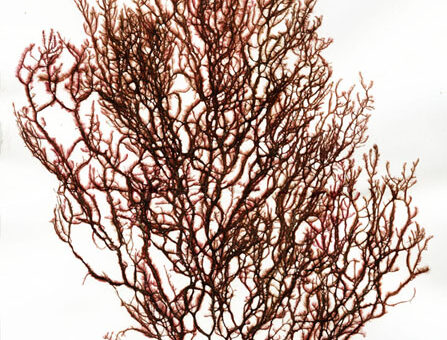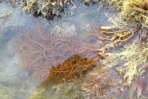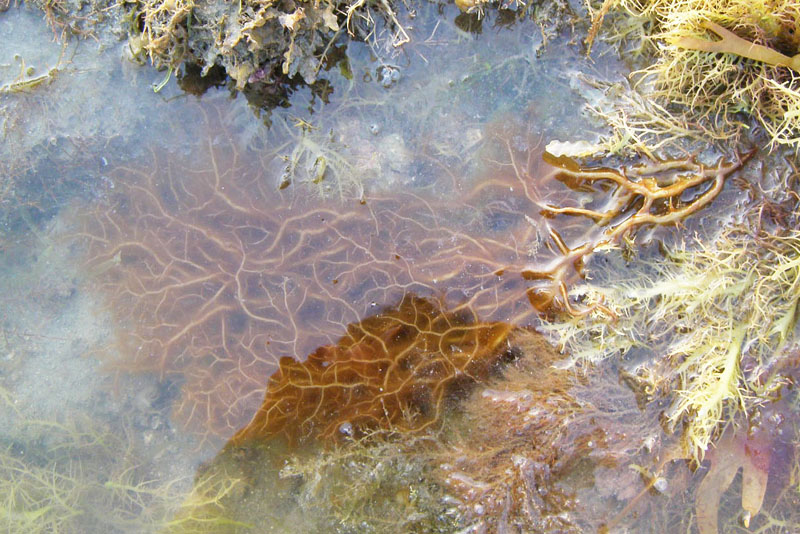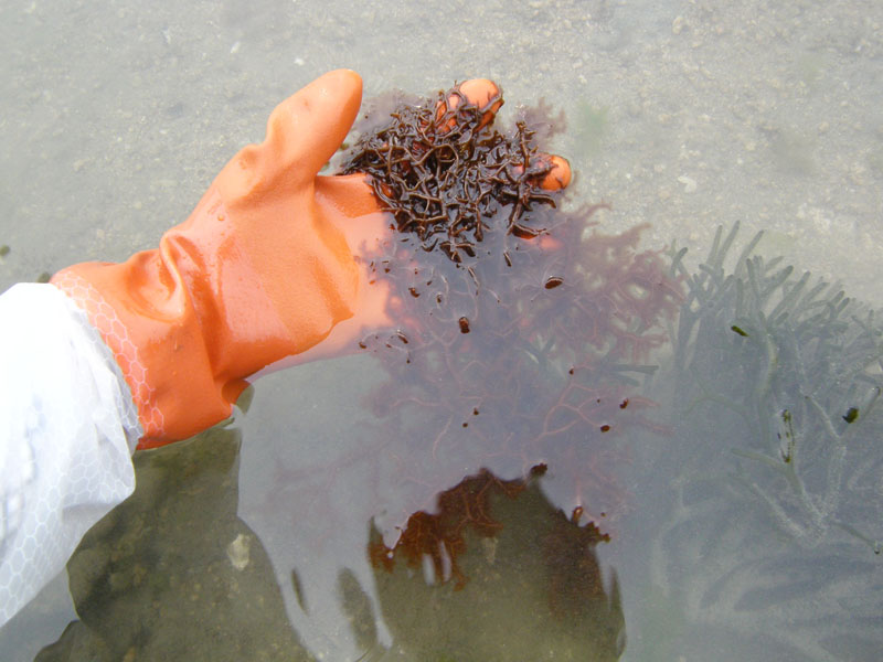 上の写真が因島の海岸に生えているケブカダジアです。細長いよく枝分かれした体には、柔らかい赤い「毛」がびっしり生えていて、これが「ケブカ(毛深)ダジア」の名前の由来になっています。2007年頃から見つかり、毎年春から初夏にかけて生育します。手で持ってみると、なんとなくモズクのような柔らかい質感があります。