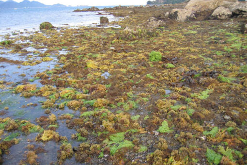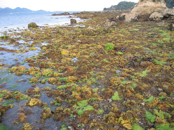 因島八重子島の海岸。春には多くの海藻がみられます。