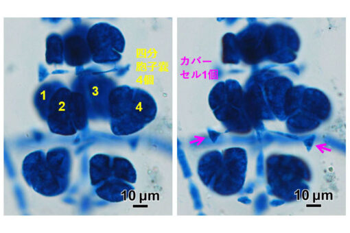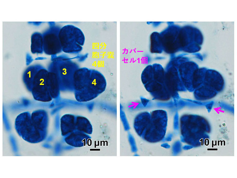 その結果、日本のケブカダジアの持つ形態の特徴(上図のように、四分胞子嚢が4個ずつできること、カバーセルと呼ばれる細胞が1個ずつできることなど)が、オーストラリアのダジア・ビローサの特徴(四分胞子嚢が6個ずつできること、カバーセルが3個、時には4個ずつできることなど)とは異なっていることを明らかにし、ケブカダジアはダジア・ビローサとは別の種であると結論しました。