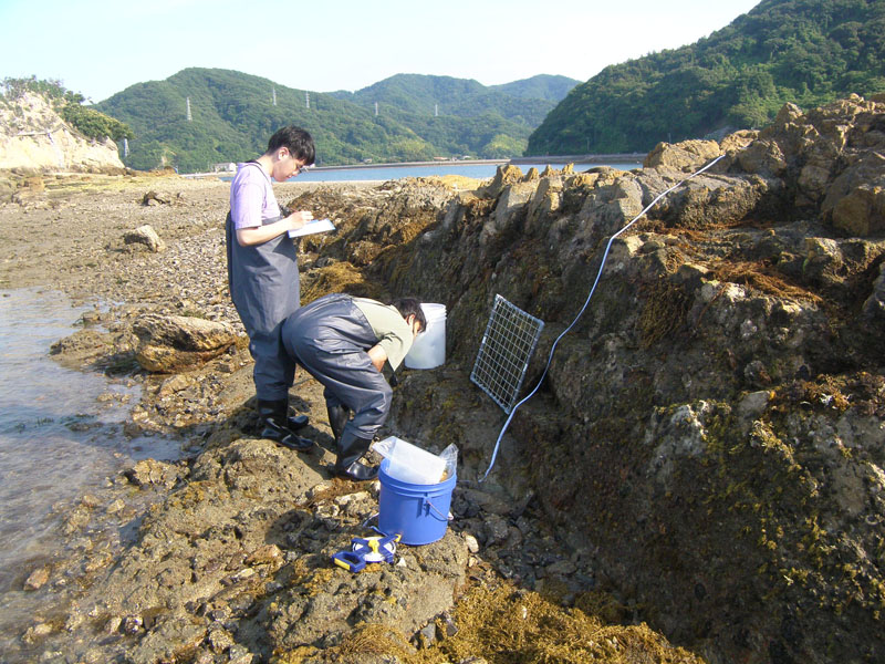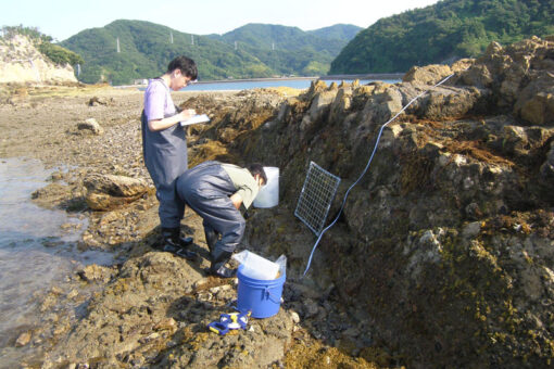 私こと山岸は、海洋植物科学研究室の学生たちと一緒に、因島の八重子島(やえこじま)という場所で、2005年度から継続的に海岸に生育する海藻の種類を調査しています。海藻の繁茂する場所は「藻場(もば)」と呼ばれ、魚類や甲殻類などの生活場として大切な役割を持っており、藻場を保全するためにも、その状況を調査して把握することが必要です。