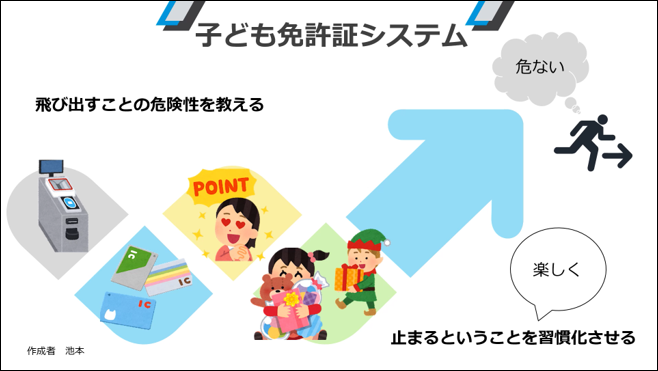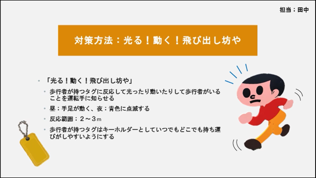 発表(プレゼンスキル)賞1位に輝いたのは、「光る!動く!飛び出し坊や」を考案した「チームあお」。こちらも子どもの交通事故防止のためのアイディアでした。車の運転者にいかに子どもの存在に気付かせるか、注意を向けさせるかについて、昔ながらの「飛び出し坊や」を改良することで対応してみよう!という、面白い提案でした。