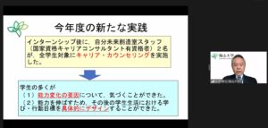 開会式後は、キャリア形成支援委員会副委員長の前田吉広講師、キャリア形成支援委員の向井勝也特命講師より、今年度のBINGO OPEN インターンシップについての実施報告がありました。BINGO OPEN インターンシップでは企業における実習だけでなく、実習前と実習後にそれぞれ研修を実施しており、経済産業省の定める社会人基礎力の考え方を評価方法に用いるなどして、インターンシップによる学生の学びや成長を定性的にも定量的にも測定し、各学生にフィードバックしています。さらに、今年度は事後研修終了後に希望する学生に対してキャリアカウンセリングを個別にも実施しました。こうした取り組みから得られた分析結果の考察や今後の指針についての報告は、多くの参加者に関心を持って聞いていただけたようでした。