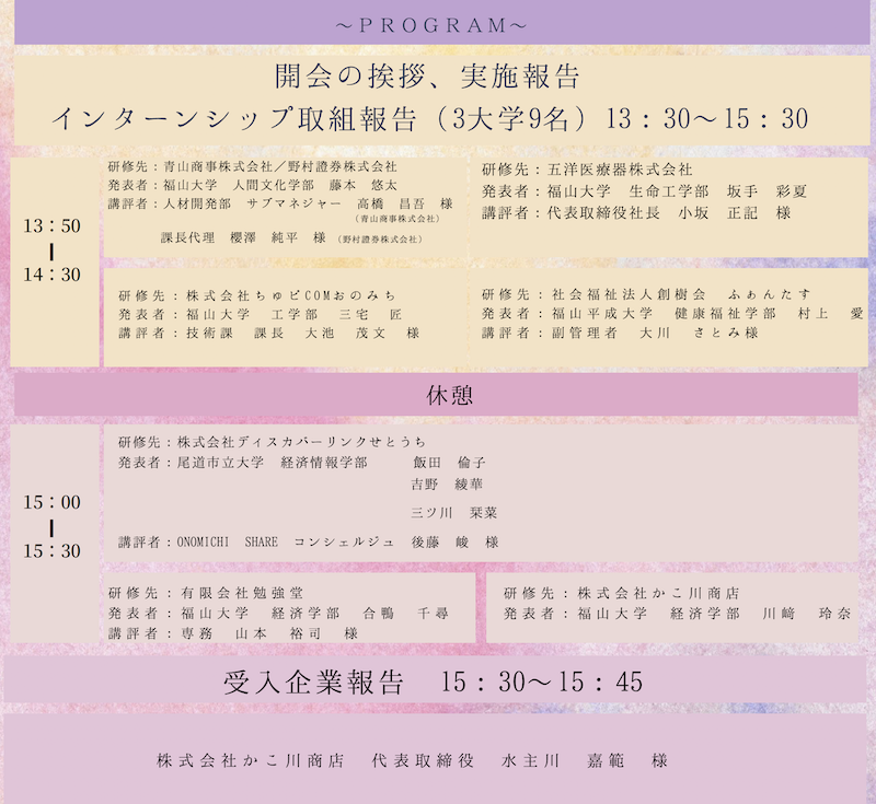 学生の発表に続く受入企業のご担当者様からの講評は、発表に対してだけでなく研修中の気づきに渉り、一つの研修を学生の視点と担当者の視点の両面から捉えたものでした。前述の終了後アンケートへの回答に依れば、各講評が参加者にとってインターンシップの意義をいっそう理解する上で大いに助けになったようです。大変お忙しい中、また土曜日にもかかわらず長時間にわたって合同成果報告会に参加いただきました講評企業の皆様にあらためて感謝申し上げます。皆様からのお言葉は、発表した学生たちにとって間違いなく大きな励みになったと思います。