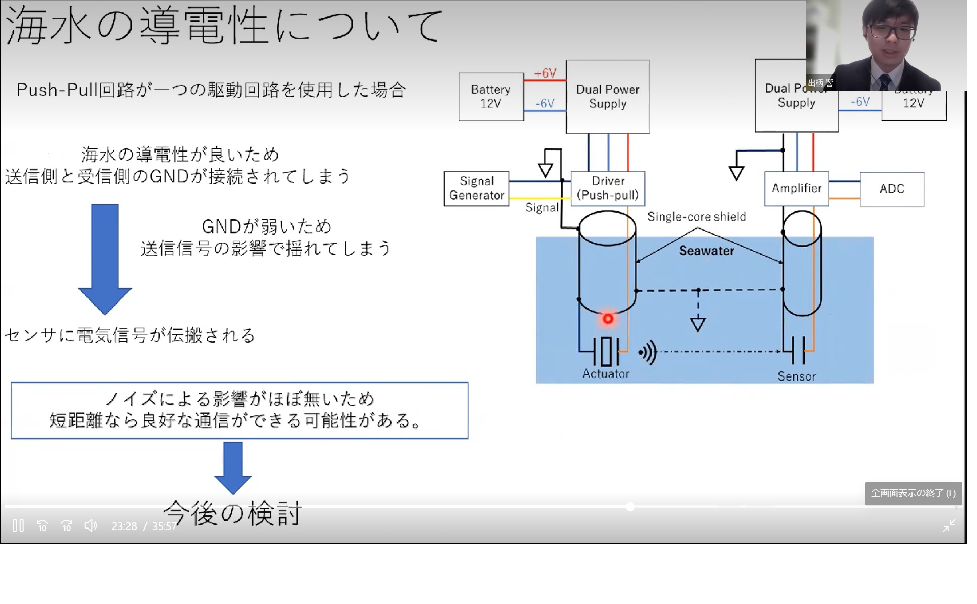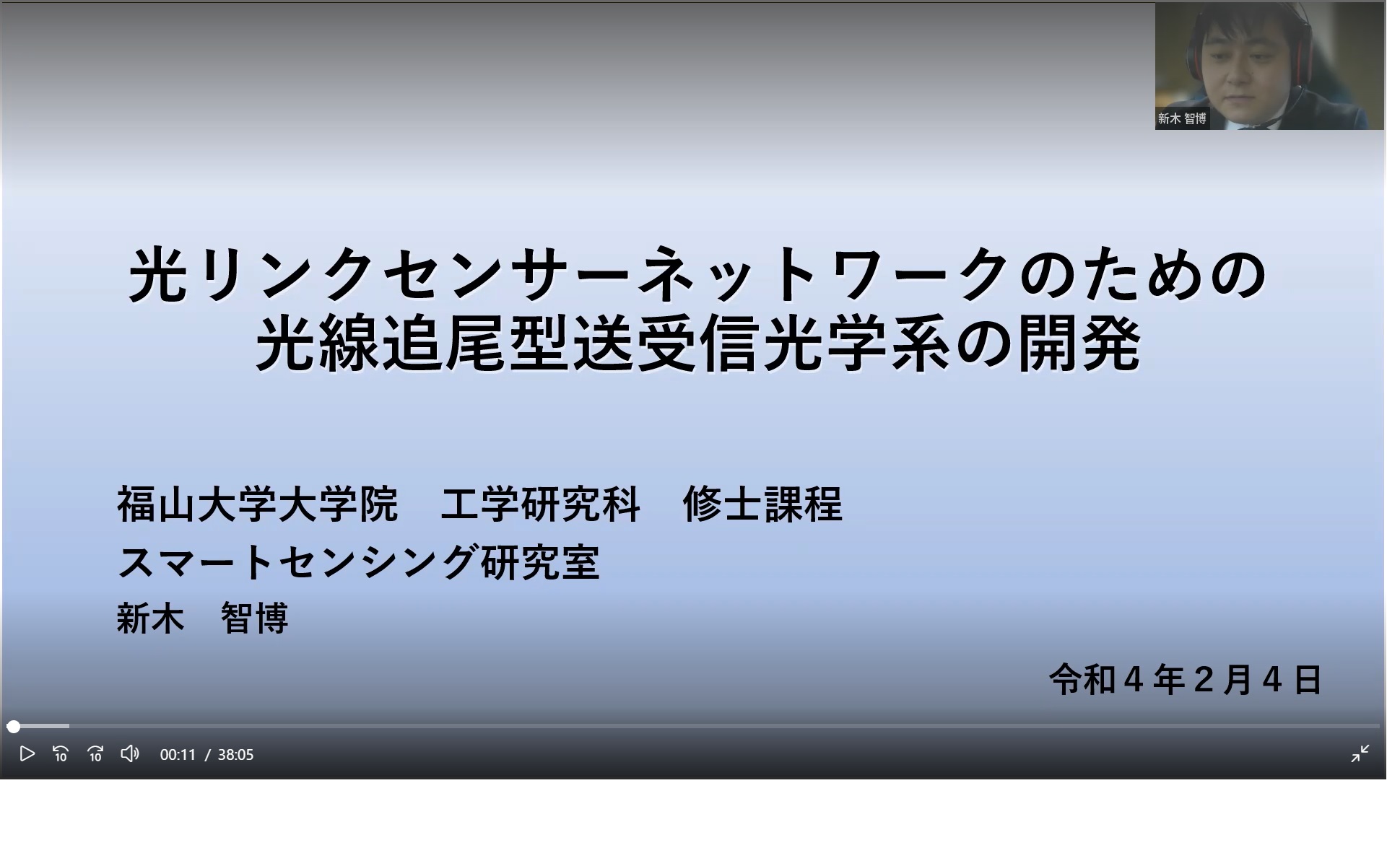 そして、同日の午後に、冒頭で述べたとおり、工学研究科電子・電気工学専攻の令和3年度修士論文公聴会が開催されました。香川研究室の新木智博君による「光リンクセンサーネットワークのための光線追尾型送受信工学系の開発」の発表です。
