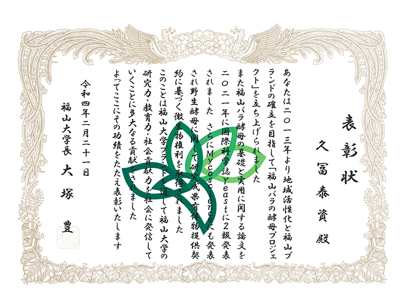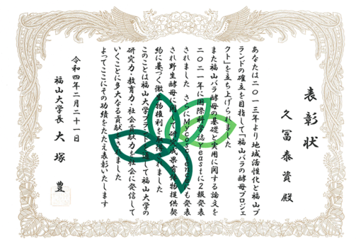 このたび(2月21日)、「福山バラの酵母プロジェクト」を通して、福山大学の研究力・教育力・地域貢献力を高める大きな功績を挙げたことに対して、久冨教授へ教員表彰(学長賞)が授与されました。