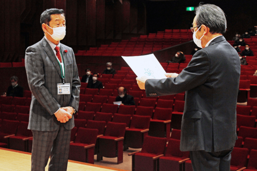 学長から一言:バラの花から抽出に成功した酵母を活かした数々の酒類や食品は、今やすっかり福山の名物の感があります。その生みの親である久富教授の表彰は、いささか遅すぎるくらいのタイミングでしたが、表彰状を贈る側としても実に誇らしく、晴れがましいことでした。全学教授会に先立つ表彰式の写真は、ウイルス感染防止で三密を避けるため閑散として見えますが、広い大学会館大ホールに集まった全教員が祝福しました。さあ、次はどんな斬新な科学的発見がもたらされることでしょう。楽しみです。