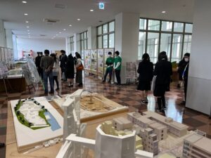 建築学科では、製図の授業が行われる製図室で、授業の時のようにスクリーンを見ながらの学科紹介が行われました。その後、3年生が案内して、卒業設計の模型展示や学年製図賞の展示を回り、建築学科での学びの成果を見てもらいました。
