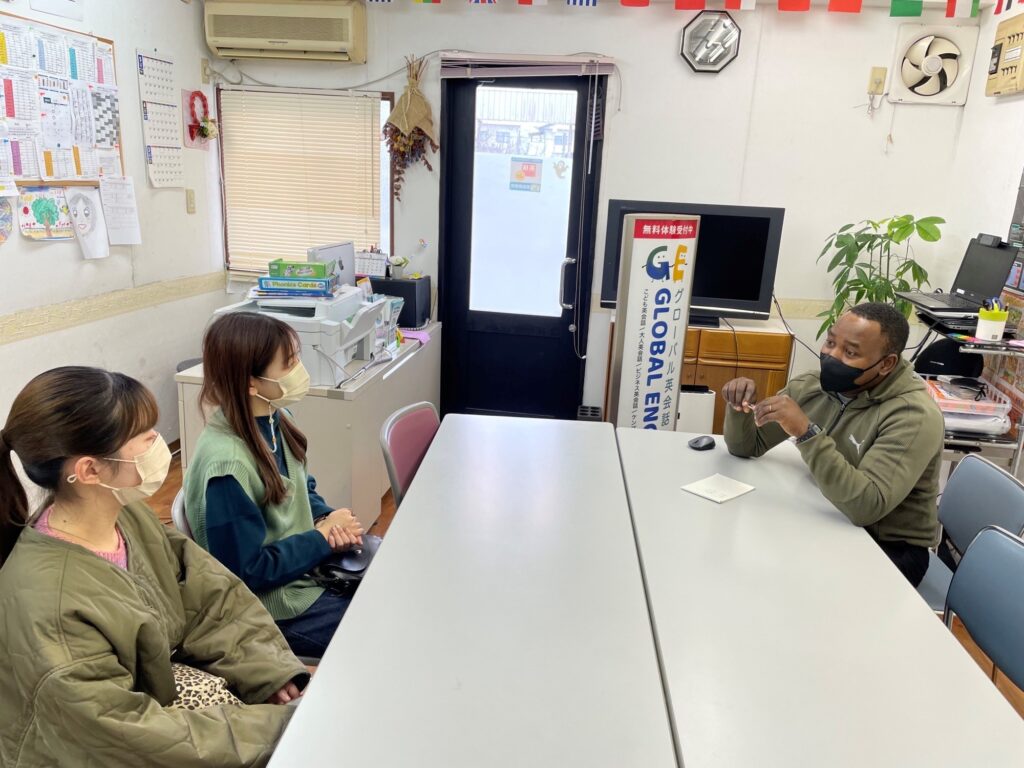 今回は、国際経済学科の卒業生で、松永町で「Global English」という英会話学校を主宰し、貿易会社の代表取締役でもあるケニア出身のエリック・ムネネさんを2名の学生が訪問してインタビューし、ボランティアの現場を見学させていただきました。