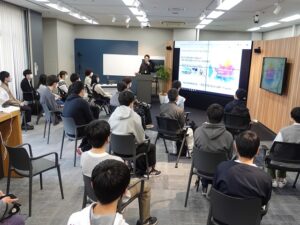 「せとうち Tech LAB」は、テクノロジーを地方都市に社会実装することを目的とした、地域発のデジタル化推進拠点です。ソフトバンクグループの紹介から、福山市・備後圏域におけるデジタル推進活動について紹介していただきました。例えば、プログラミング教室やVR体感といったびんごキッズラボやタバコポイ捨て調査支援などについて紹介していただきました。昨年度、3年生が受講したSB特別講義も活動のひとつになります。