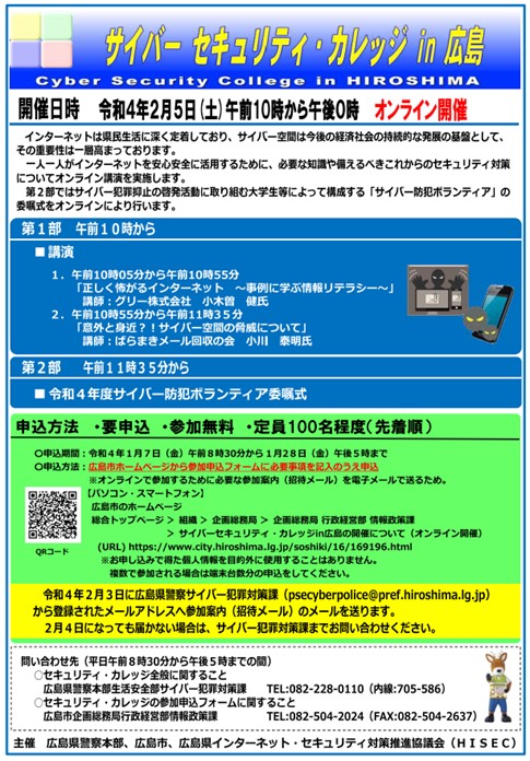本題の「サイバーセキュリティ・カレッジ in 広島」は、正しいセキュリティ対策を学ぶ場として、広島県警察、広島市、広島県インターネット・セキュリティ対策推進協議会(通称:HISEC)が主催するイベントです。毎年2月に実施され、今年は2月5日(土)にオンラインで開催されました。今年で16回目を迎えるそうです。