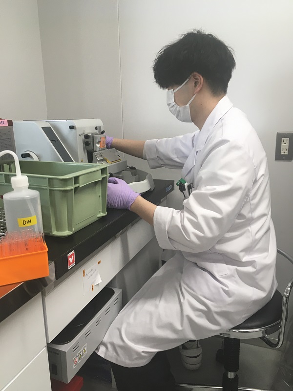 1枚目の写真は、マウス肝臓をスライスしている場面です。紙のような薄さでスライスする必要がありますので、慣れが必要です。山内君が頑張っています。早くも熟練した研究者のようです。組織に穴は空いておりませんか?
