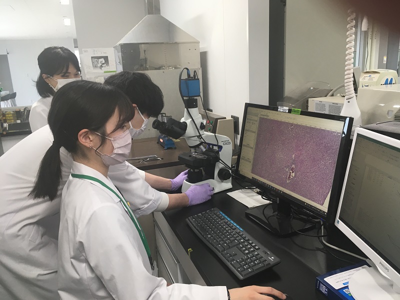 山内君と山脇さんは、「食品機能成分による疾病予防効果及び生理活性作用の解明」の研究を行うため、現在、未来創造館7階のオープンラボにて、柴田紗知講師の指導により実験手法を学んでいます。今回は、その研究に必要なマウス組織の病理染色を学んでいる風景を見てみましょう。