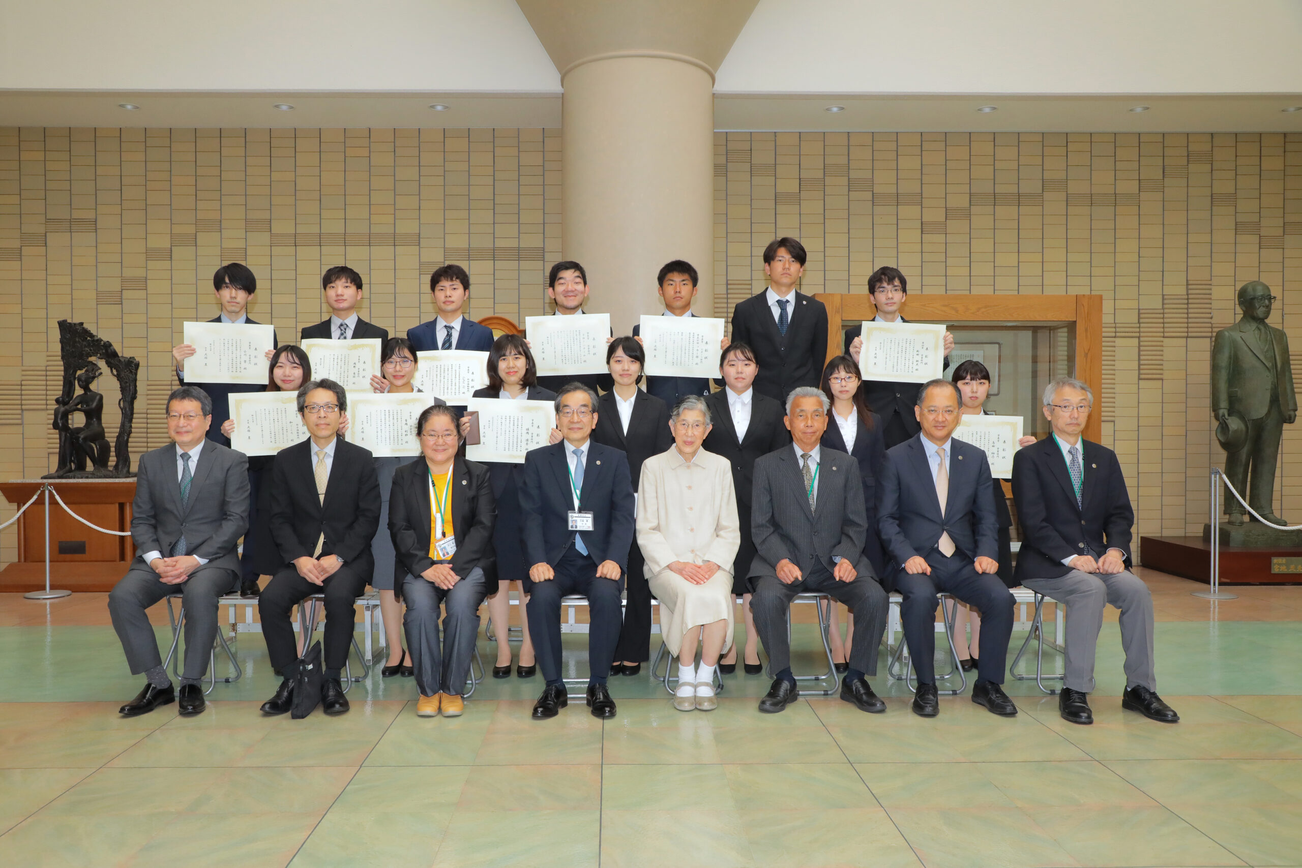 受賞者及び関係者の方々には大変お待たせし、ご心配をおかけしておりましたが、活動指針がレベル1になりましたことから、先日大学会館ロビーにて、関係者が一堂に会して表彰式を執り行いました。