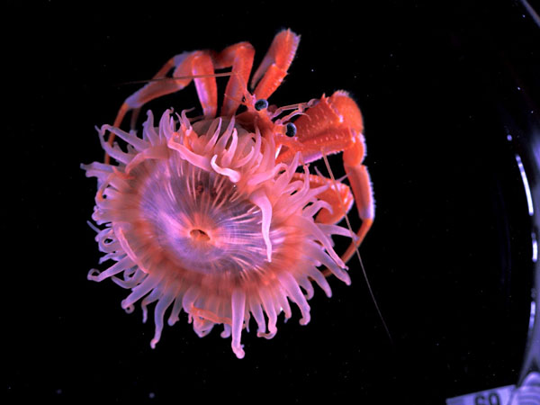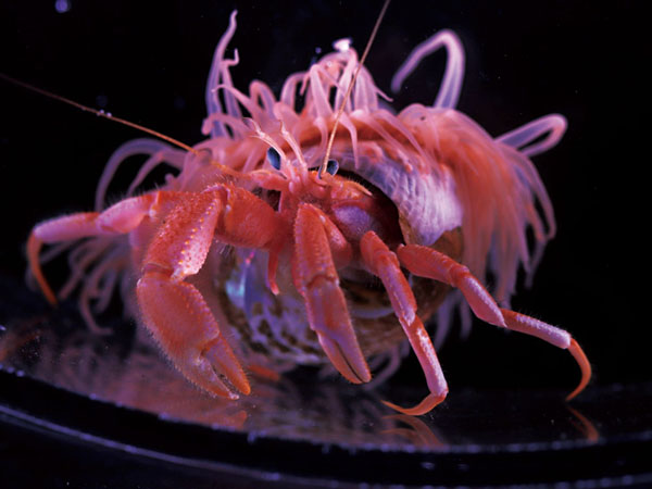 泉講師は前任地の琉球大学にて、東京大学大気海洋研究所の吉川晟弘研究員、鳥羽水族館飼育研究部の森滝丈也氏、三重大学大学院生物資源学研究科の木村妙子教授、千葉県立中央博物館分館海の博物館の柳研介主任上席研究員と研究チームを組み、三重県熊野灘および静岡県駿河湾の深海底において採集されたジンゴロウヤドカリが棲む貝殻上に共生するイソギンチャクを研究しました。講師は主に採集された標本の観察、刺胞の検鏡および複数DNA領域を用いた分子系統解析を担当し、本種がキンカライソギンチャク属の未記載種(※)であることを明らかにしました。また、共同研究者の吉川研究員が鳥羽水族館の協力の下で行った行動観察により、イソギンチャクが常に上方向を向き、また宿主ヤドカリの貝殻の引っ越し行動の後にイソギンチャクを新しい貝殻へと持ち運ぶという行動も確認されました。本種がジンゴロウヤドカリ以外のヤドカリと共生する例が見当たらないことから、ヒメキンカライソギンチャクとヤドカリは例のない強い共生関係にあると示唆されます。