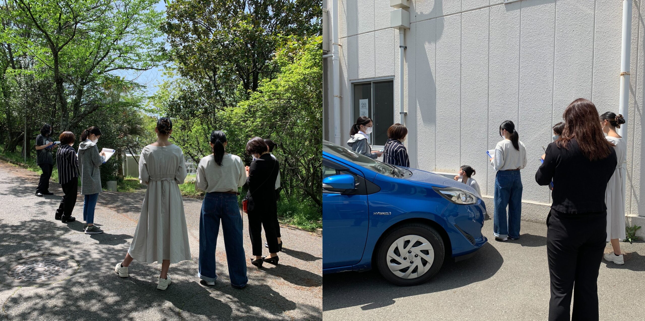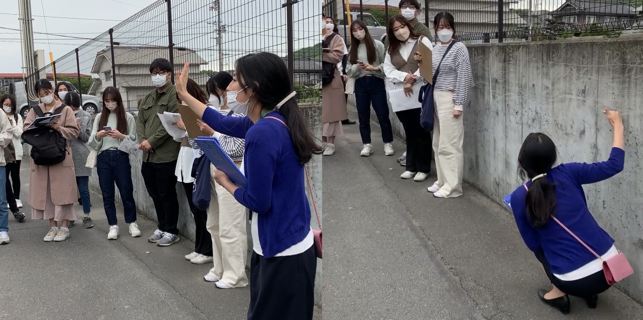 <5月9日(月)のフィールドワーク事前学習の様子。手前の青い服を着ているのが濱本助手です。>