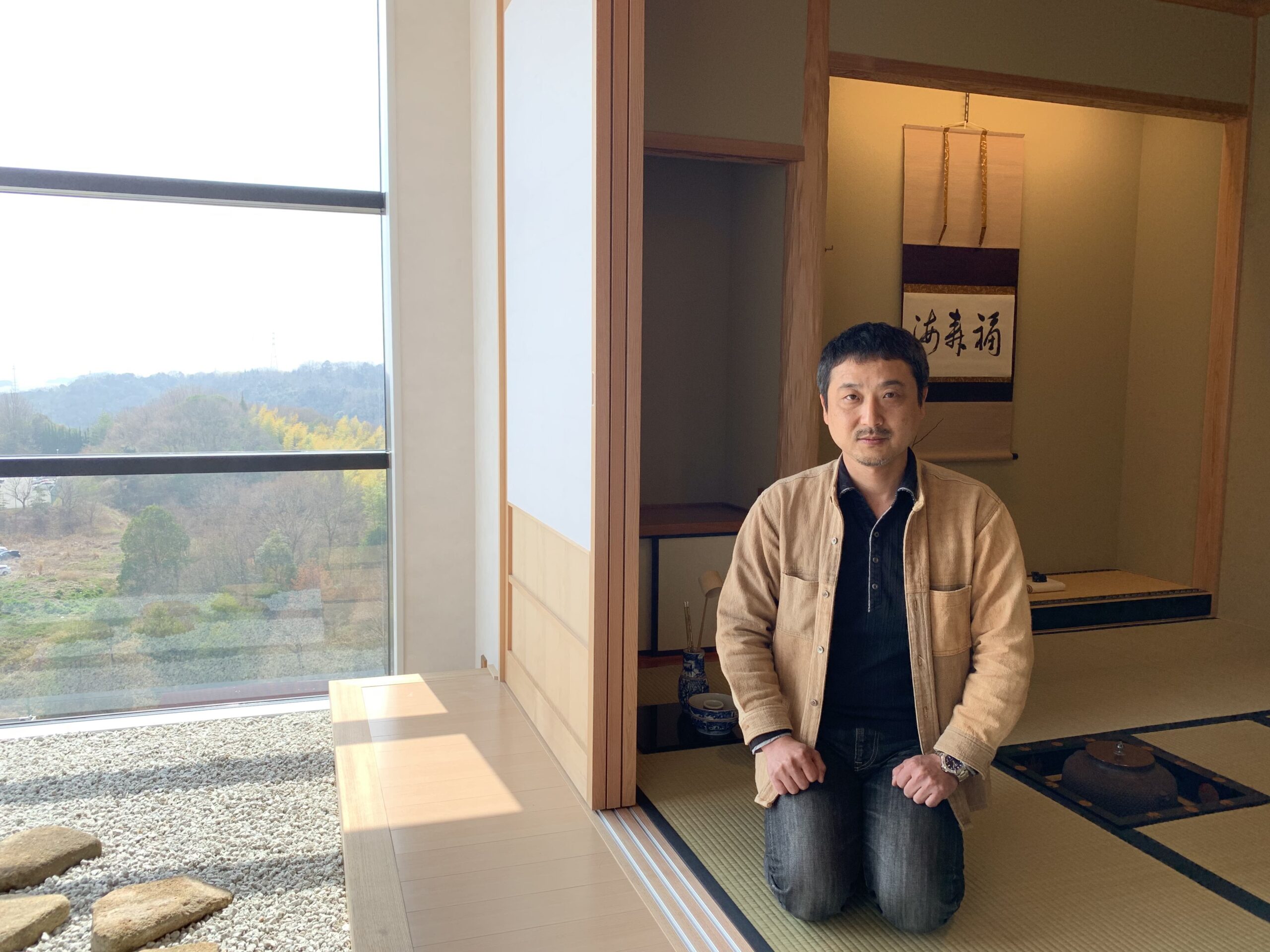 バイオマス建材を使った好例である本学の茶室「育志菴(いくしあん)」の備後表(製作者の建築学科:佐藤教授@未来創造館11階)