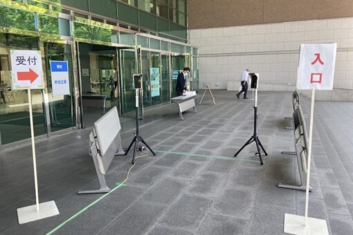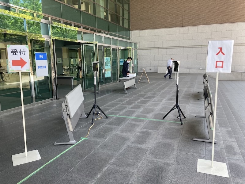 対面による実施会場での感染症防止対策として、まず、3部制(第1部:13:00〜14:30、第2部:14:50〜16:20、第3部:16:40〜18:10)を採用しました。各部あたりの企業ブース数を最大27個に制限し、ブース間隔を広くとり、余裕をもって移動、聴講できるようにしました。また、会場入口の受付に検温器と消毒液を設置し、各部の入館の際に必ず体温チェックと手指消毒を行わなければならないように導線を設けました。さらに、この度は、各部90分間を説明時間15分移動時間5分間の4クールに分け、20分毎にブースを移動する方式をとりました。その際の移動順路も設け会場内の移動中の混雑を避けることに努めました。