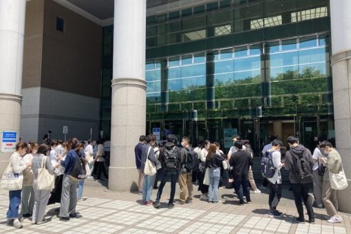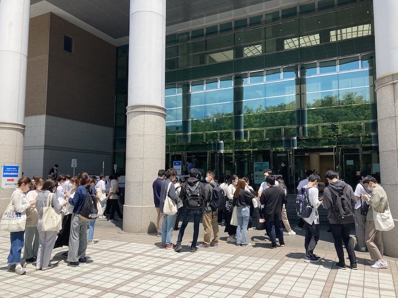 コロナ禍を経て、3年ぶりの対面開催で取り入れたもう一つの新機軸がオンラインでの参加アンケート調査です。これまでは、出口で参加者にアンケート用紙に記入してもらい、提出箱に投函後に退場していたのですが、出口で学生が滞留すること、また、後の集計に時間が掛るということ、さらに、大量の紙を使ってしまうという課題がありました。この度は出口アンケートをOFFICE365のFormsを用いて作成し、出口付近の壁に掲示したQRコードですぐに回答ページにアクセスできるようにしました。結果は良好。当日は天候に恵まれたこともあり、学生は風通しの良い会場の外で、各自のスマートフォンから直ぐに回答していました。