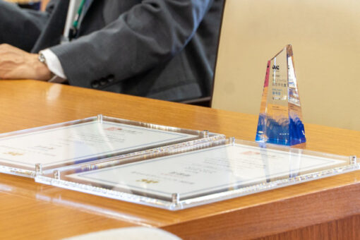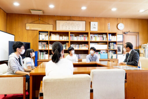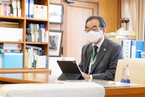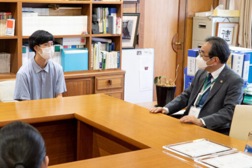 先日(6月22日(水))、制作者が学長室を訪問して受賞の報告を行いました。作品テーマ決定の背景や制作意図等の説明を行いました。大塚学長からは、作品についてのお褒めの言葉と今後の活躍に期待する激励をいただきました。その後、将来の目標や制作環境に関係する要望などについて歓談しました。