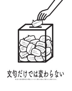 新聞広告部門優秀賞の受賞作品は、選挙の投票率の低さをテーマとした「文句だけでは変わらない」です。選挙での若者の投票行動に一石を投じたいとの意図をもって制作した作品で、制作者は多田圭吾さん(4年生)です。