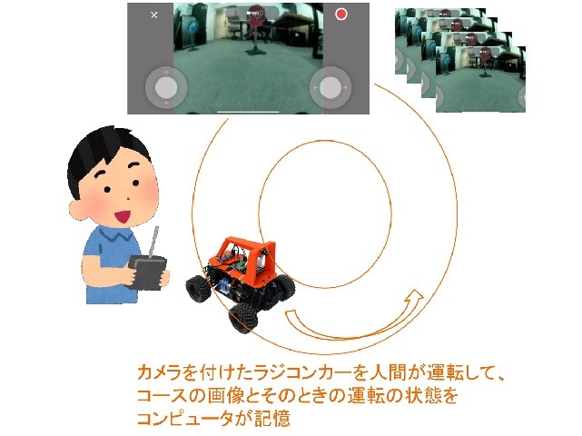 Donkey Carには、カメラとRaspberry Pi という小型コンピュータが搭載されています。まず、人がDonkey Carを運転しながら、沢山の風景を撮影します。このとき、風景だけでなく、それぞれの風景が撮影されたとき、どのような操作(方向と速度)が行われたか、も記録されます。運転しながら、このデータを1万組くらい収集します。