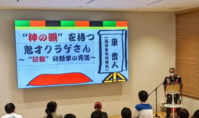 【海洋生物科学科】サイエンス・トーク “Blue in Green” 第1弾「“神の眼”をもつ鬼才クラゲさん~“記載” 分類学の究道~」(泉講師)