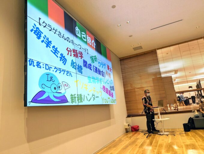 第1弾は、泉講師の「“神の眼”をもつ鬼才クラゲさん~“記載” 分類学の究道~」です。生物学研究の最大のロマンの一つ、それが “新種”の発見!……… 海で標本庫で水族館で、日々新種の発見に取り組んでいる泉講師が、記載分類学の夢の世界へ私たちを誘いました!! まずは、今回のサイエンス・トークの世話人を務めている私(阪本)から泉講師の経歴を紹介しました。
